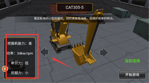 1、開始游戲后先選一臺適合當前任務(wù)的挖掘機,查看它的挖掘力和牽引力,確保性能滿足工地需求。