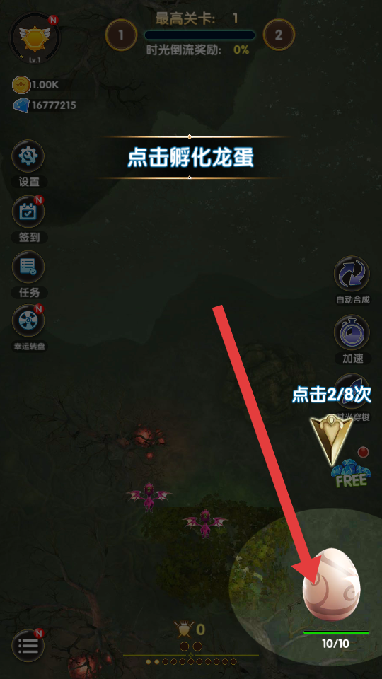 1、點擊游玩的界面,龍蛋完成點擊孵化龍蛋的操作,積累點擊次數(shù)如點擊八次,獲取新飛龍。