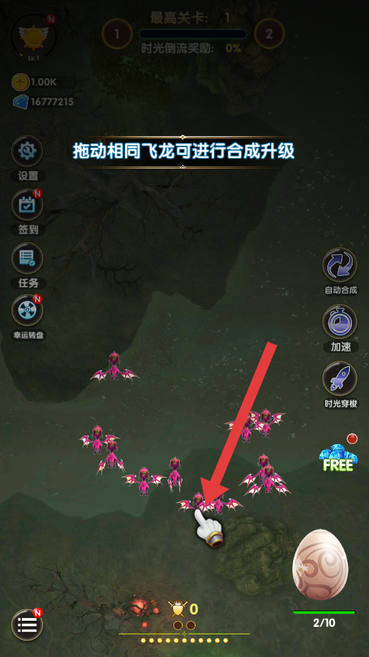 1、飛龍孵化與合成進化:通過獲取龍蛋孵化出基礎小龍,將相同等級的飛龍拖動合成,逐步進化為更高階的強力飛龍;持續(xù)合成可解鎖稀有飛龍形態(tài)。