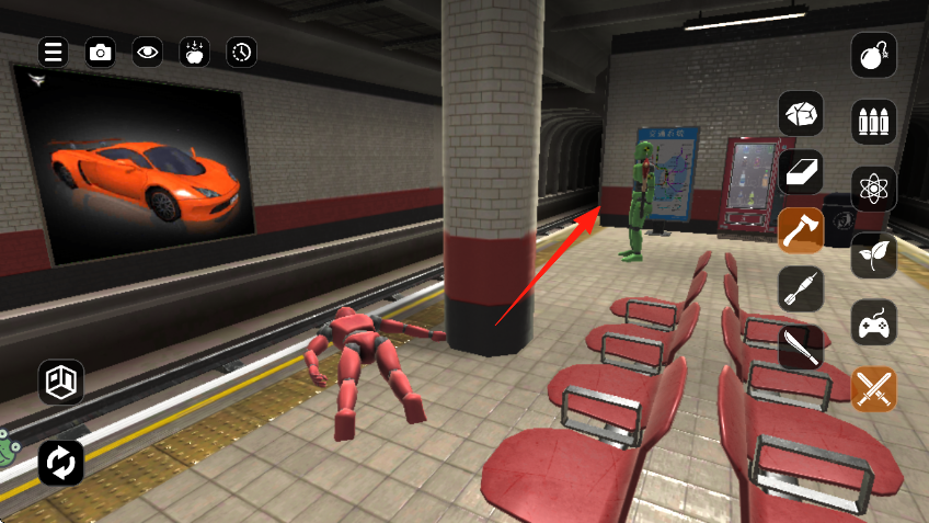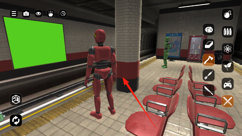 1、進(jìn)入地鐵站場景,屏幕右側(cè)有各類道具圖標(biāo)如紅箭頭所指的錘子,點(diǎn)擊選擇道具來武裝自己。