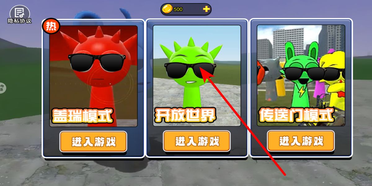 1、點擊開始游戲進入選模式界面,有蓋瑞模式、開放世界、傳送門模式可選,不同模式規(guī)則與場景不同,選后進入對應(yīng)游戲場景開啟冒險。