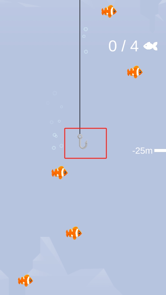 1、操控魚鉤在水中移動,瞄準橙色小魚,利用魚鉤的位置調(diào)整,精準靠近魚群,為成功釣魚做準備。