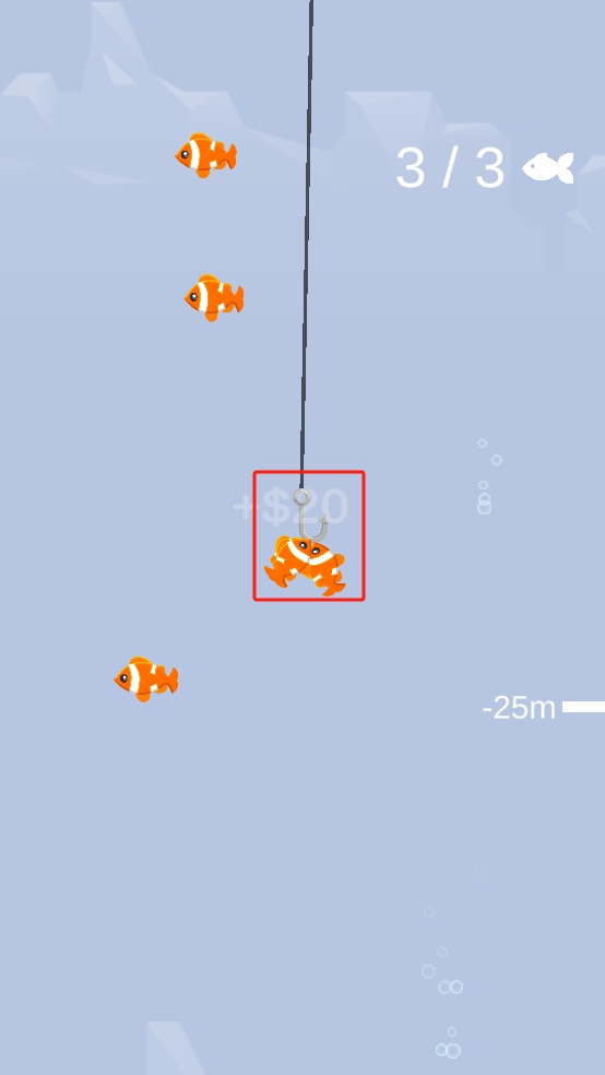 2、當魚鉤靠近小魚時,等待合適時機,讓小魚上鉤,可一次嘗試釣多條魚,提升釣魚效率,盡快達成目標數(shù)量。
