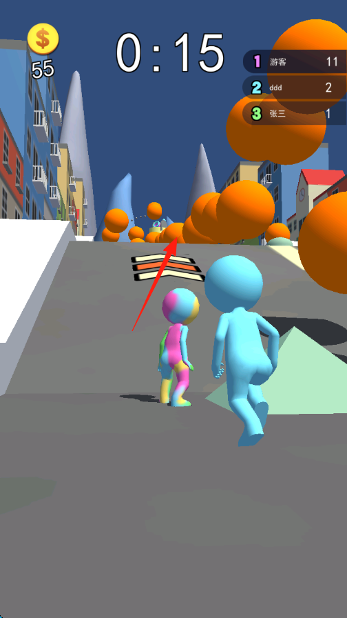 1、游戲開始,注意屏幕上方的倒計(jì)時(shí)【0:51】和玩家排名,操控角色沿著道路前進(jìn),收集途中類似琴鍵的道具紅箭頭所指。