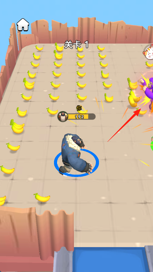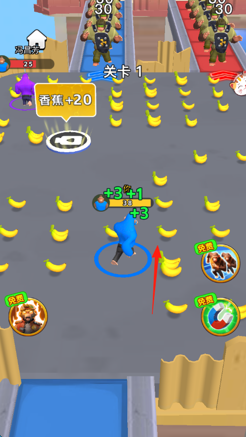1、進入【關(guān)卡1】,操控藍色角色在滿是香蕉的區(qū)域移動,收集香蕉增加數(shù)量如【香蕉+20】。