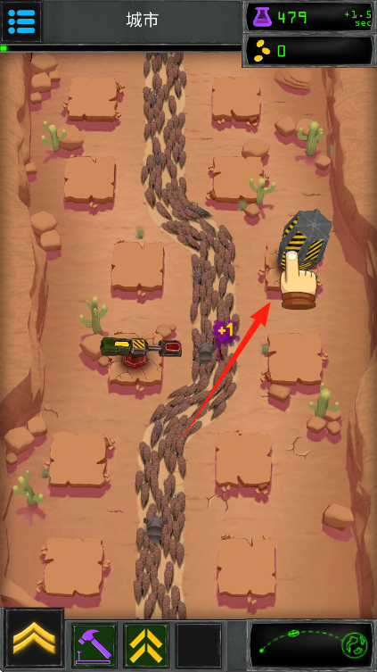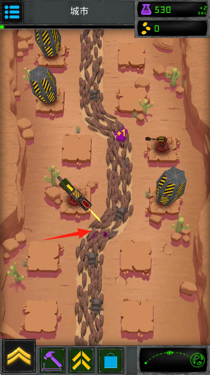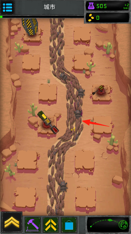 1、進(jìn)入游戲城市界面,觀察到有蟲子大軍來襲,點擊屏幕放置防御炮塔紅箭頭所指。
