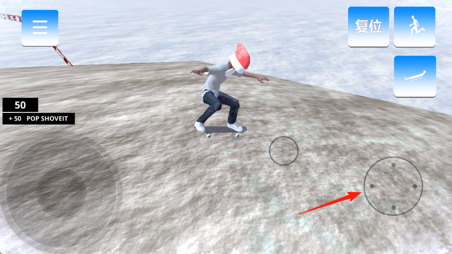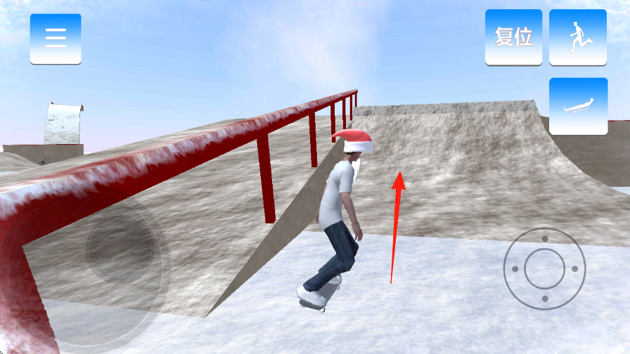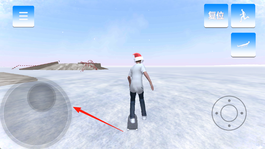1、進(jìn)入游戲,通過(guò)左下角虛擬搖桿紅箭頭所指操控角色在滑板上移動(dòng),前往前方的滑板場(chǎng)地。