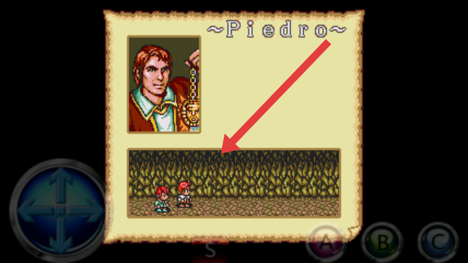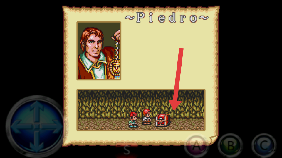 2、進(jìn)入Piedro洞穴場景,用方向鍵控制移動,沿路徑探索,遇寶箱如紅箱優(yōu)先開啟,獲取道具裝備,提升能力。