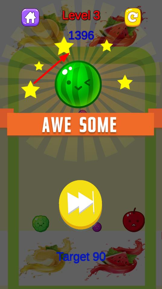 2、沉浸式視聽(tīng)呈現(xiàn):采用卡通可愛(ài)的美術(shù)風(fēng)格,水果造型鮮活靈動(dòng),合并時(shí)伴有清新特效,搭配輕松明快的背景音樂(lè),從視覺(jué)與聽(tīng)覺(jué)雙重營(yíng)造愉悅氛圍,增強(qiáng)游玩代入感。