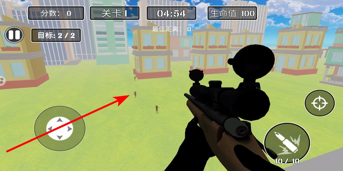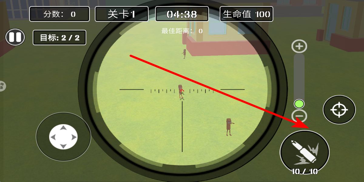 1、瞄準(zhǔn)鎖定目標(biāo):通過(guò)高精度狙擊鏡觀察場(chǎng)景,發(fā)現(xiàn)四處亂竄的木棍人后,滑動(dòng)屏幕調(diào)整瞄準(zhǔn)鏡焦距,將十字準(zhǔn)星鎖定目標(biāo),為精準(zhǔn)射擊奠定基礎(chǔ)。