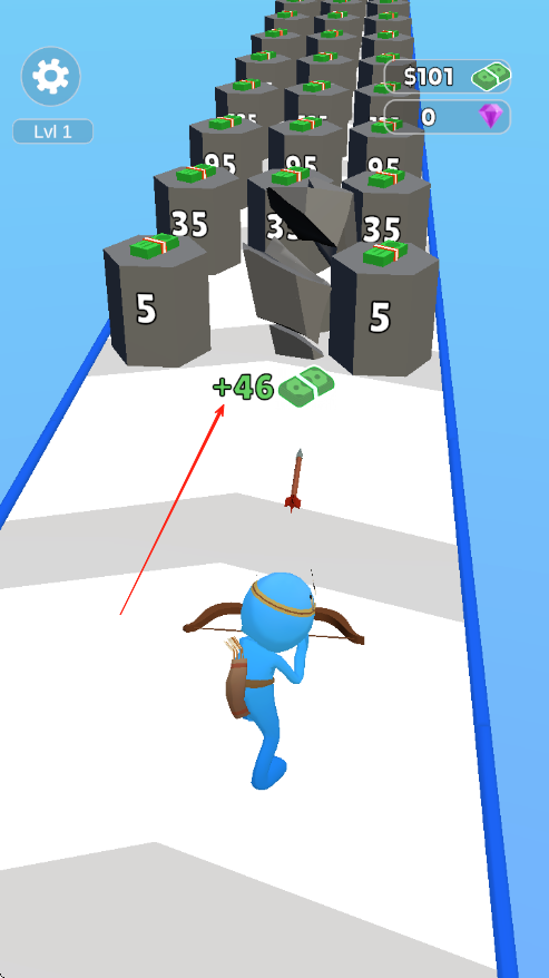 2、操控隊伍前進,撞開帶有金錢標識的障礙物,收集如紅箭頭所指的金錢【+46】,增加游戲貨幣。