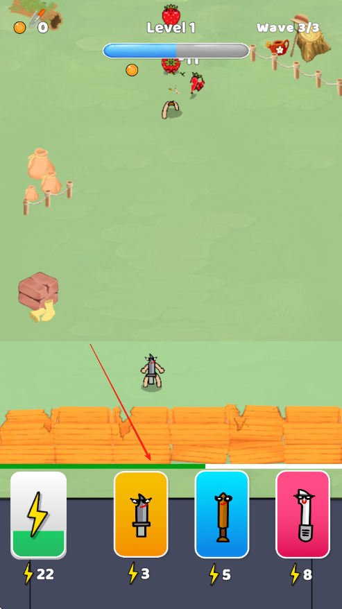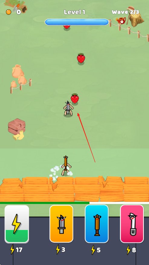 1、在【Level1】關卡,查看波次進度【W(wǎng)ave2/3】,操控角色按紅箭頭方向移動,收集途中的草莓。