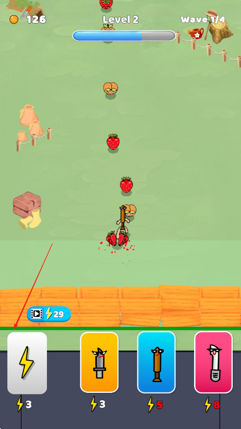 3、成功通過【Level1】后進入【Level2】,繼續(xù)收集水果,利用技能消滅敵人,關注波次進度【W(wǎng)ave1/4】,完成關卡目標。