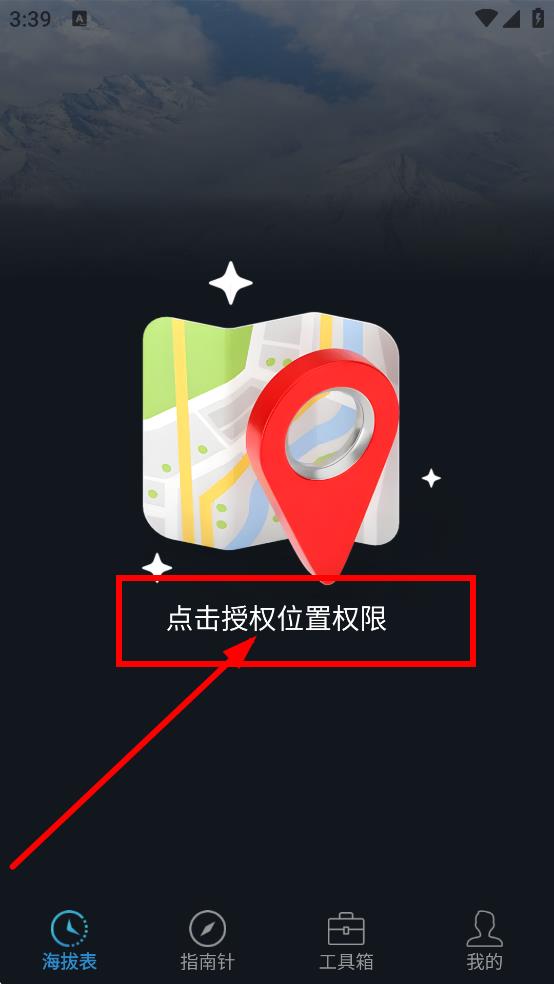 1、打開(kāi)軟件后,首先要點(diǎn)擊授權(quán)位置權(quán)限,這樣才能正常使用后續(xù)的海拔測(cè)量、指南針等功能。