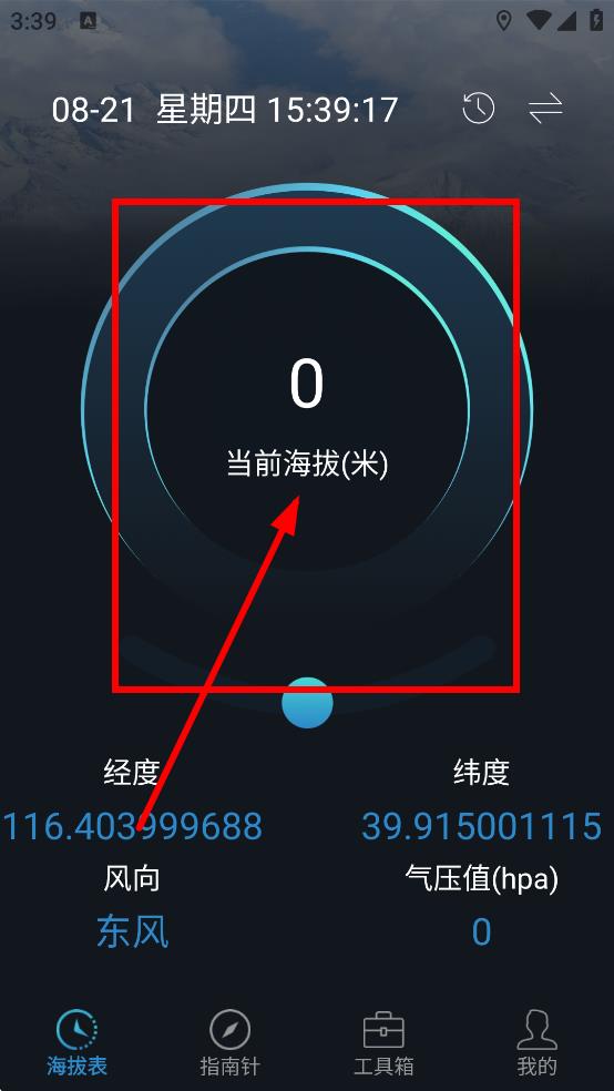 2、進(jìn)入海拔表界面,可查看當(dāng)前海拔數(shù)值,同時(shí)還能獲取經(jīng)緯度、風(fēng)向以及氣壓值等相關(guān)信息。
