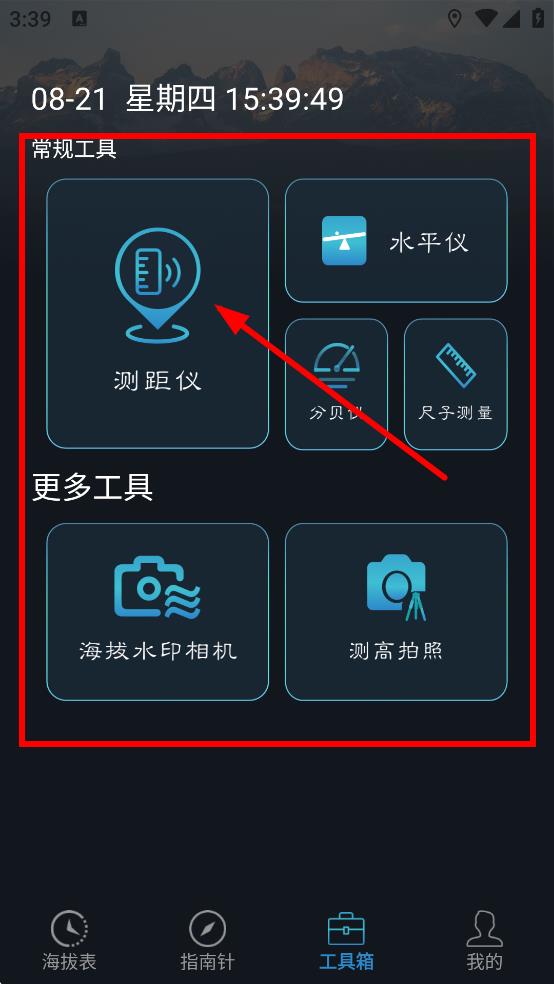 3、切換到工具箱界面,這里有測(cè)距儀、水平儀、分貝儀、尺子測(cè)量等常規(guī)工具,還有海拔水印相機(jī)、測(cè)高拍照等更多工具可供使用。