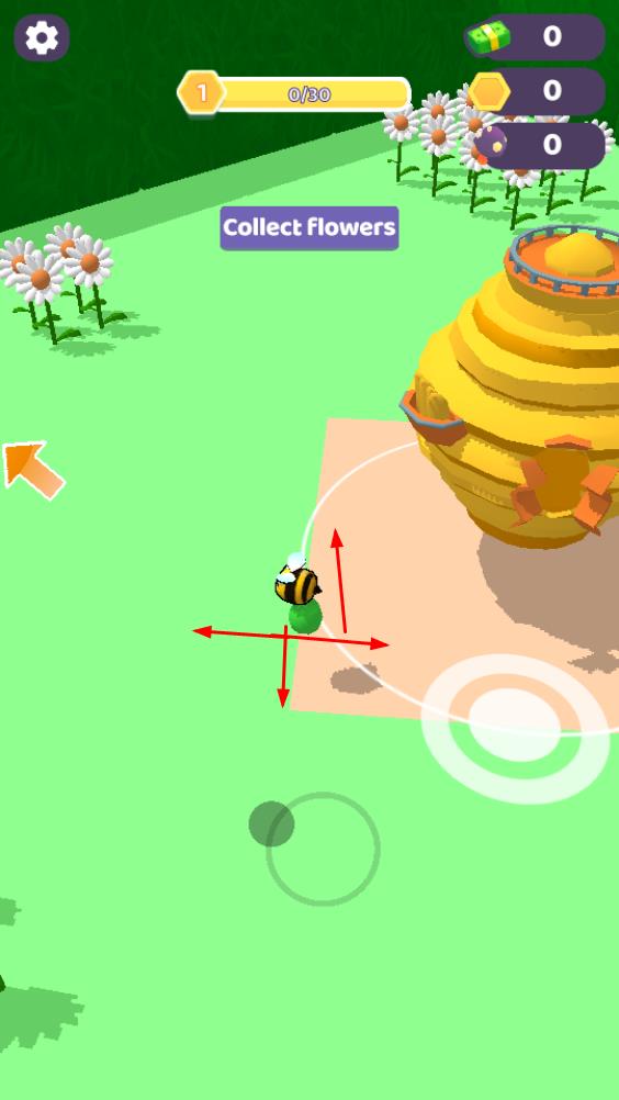 1、操控蜜蜂在場景移動,靠近白色花朵完成采集,開啟收集進程,積累花朵數(shù)量。