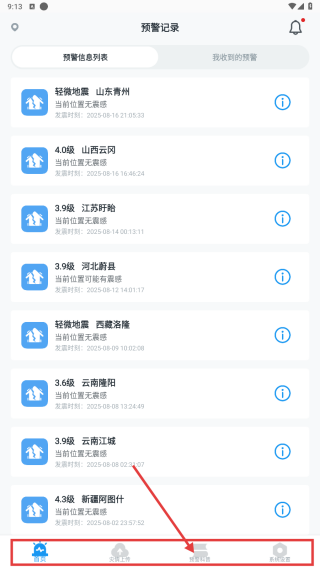 1、進(jìn)入預(yù)警記錄頁面,瀏覽地震預(yù)警信息列表,了解不同地區(qū)的預(yù)警詳情與定位狀態(tài)。