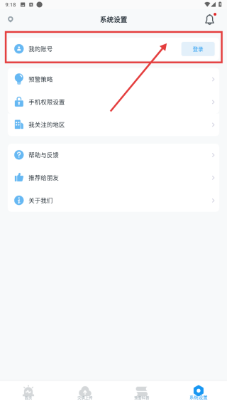 3、進(jìn)入系統(tǒng)設(shè)置頁,點(diǎn)擊我的賬號右側(cè)登錄按鈕,完成賬號登錄,管理預(yù)警關(guān)注等信息。