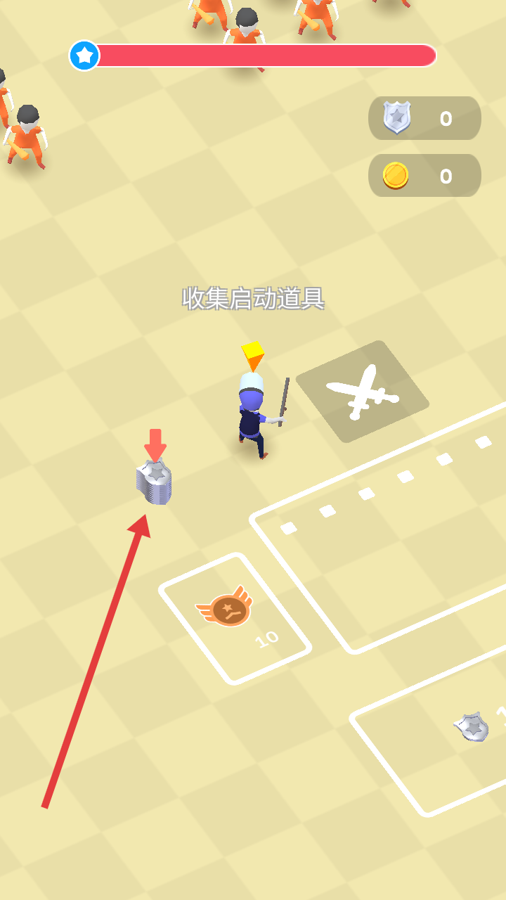 1、操控角色移動,優(yōu)先收集地面銀色啟動道具,積累資源,同時留意周圍金幣、盾牌,拓展物資。