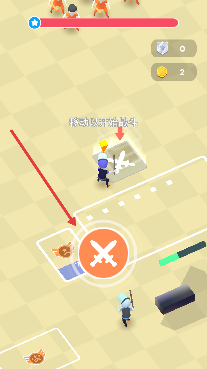 3、返回飛機(jī)標(biāo)識區(qū)域,點(diǎn)擊戰(zhàn)斗按鈕,移動角色觸發(fā)戰(zhàn)斗,利用武器擊敗橙色敵人,推進(jìn)關(guān)卡進(jìn)程。