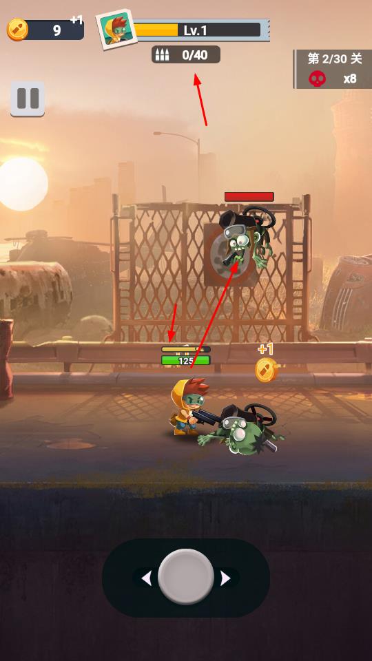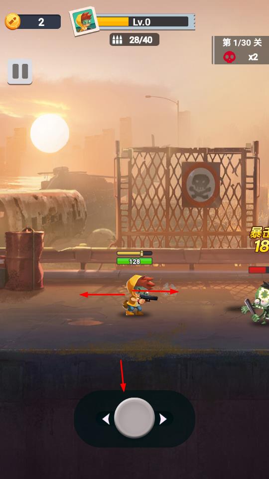 1、滑動(dòng)下方搖桿操控角色移動(dòng),調(diào)整站位瞄準(zhǔn)僵尸,開啟射擊進(jìn)程。