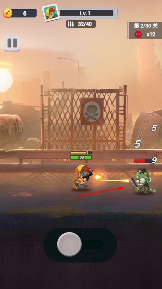 2、自動(dòng)射擊消耗彈藥,擊敗僵尸獲金幣、經(jīng)驗(yàn),提升等級戰(zhàn)力,推進(jìn)關(guān)卡。