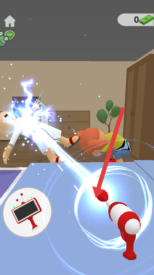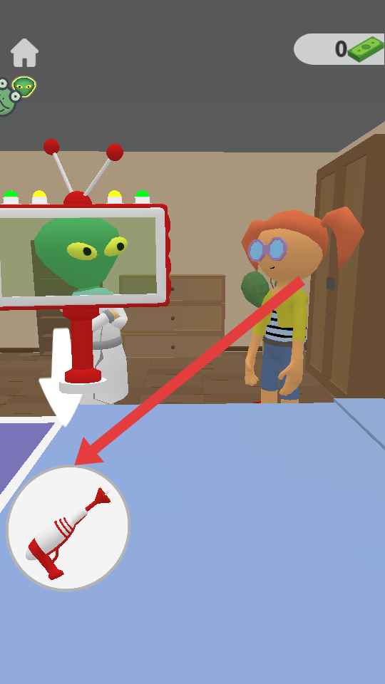 3、觀察角色操作后的場景反饋,嘗試將紅色射線槍與外星人電視裝置組合使用,完成趣味解謎挑戰(zhàn)。