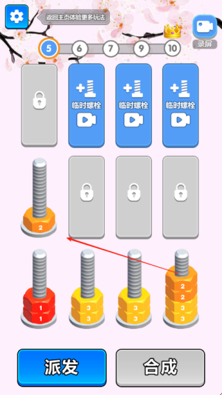 2、道具使用策略:合理利用游戲中的道具,如顏色替換道具,可將一種螺絲顏色變?yōu)樗桀伾陉P鍵時候打破僵局,消除道具則能瞬間消除場上同色螺絲。