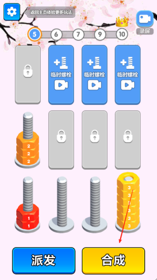 3、完成一定數(shù)量螺栓合并后,點擊下方【合成】按鈕,進行批量合成,提升整體等級,推進游戲進程。