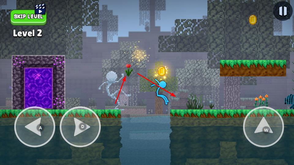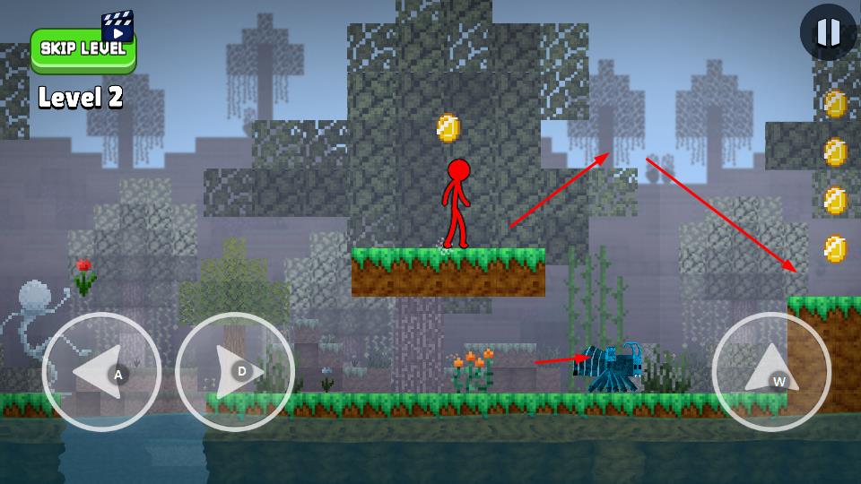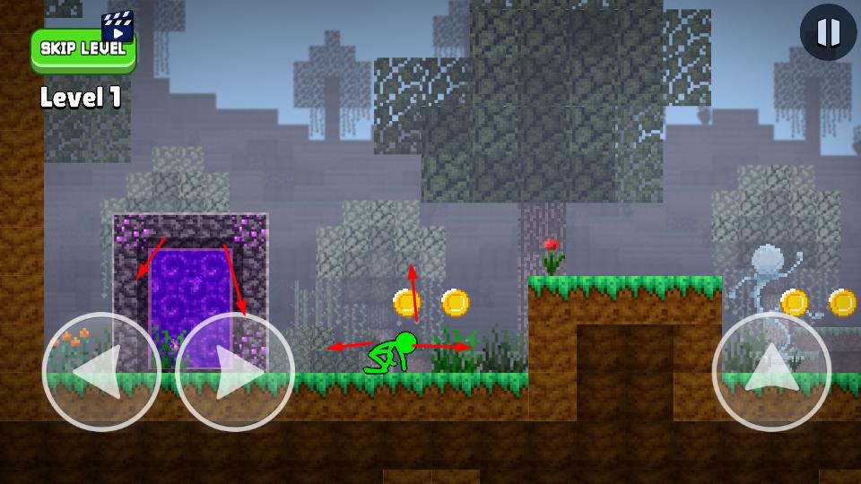 1、進(jìn)入Level1,通過(guò)左下角方向鍵控制火柴人移動(dòng),收集場(chǎng)景內(nèi)金幣,靠近紫色傳送門。