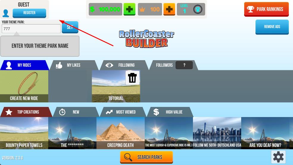 1、注冊(cè)賬號(hào),設(shè)置主題公園名稱;瀏覽TOP CREATIONS,NEW等板塊的過山車作品,或用SEARCH PARKS查找。
