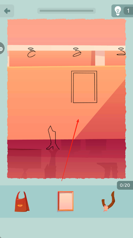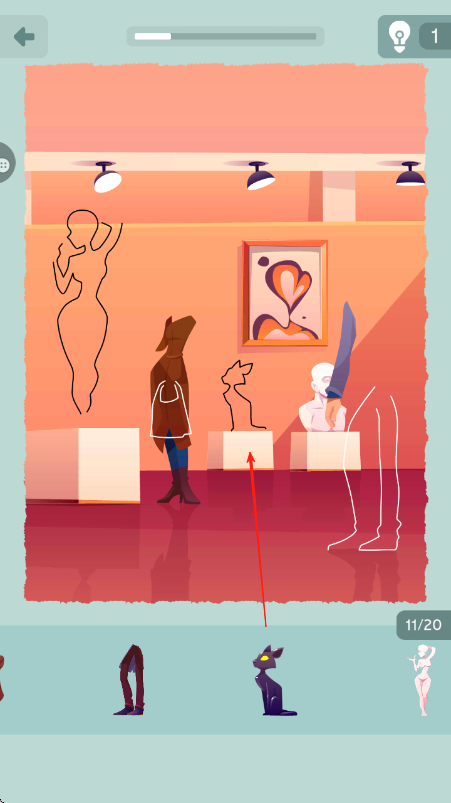 1、進(jìn)入關(guān)卡,觀察輪廓圖空缺,從下方選對應(yīng)素材,按紅箭頭放至正確位置,填充基礎(chǔ)部分。