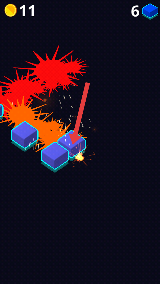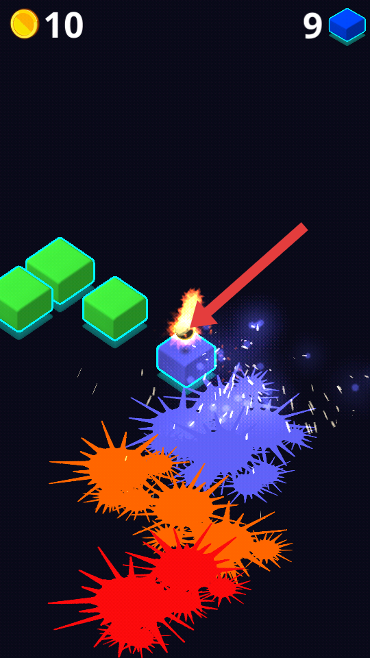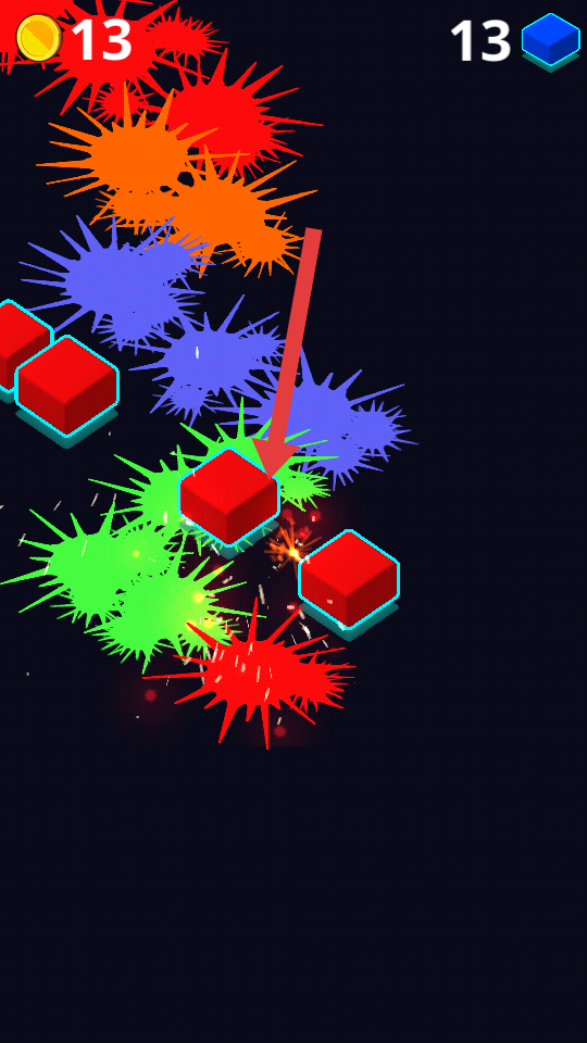 1、進入游戲,點擊屏幕操控球球跳動,擊碎可獲金幣,注意彩色方塊,規(guī)劃順序,優(yōu)先清理難處理的。