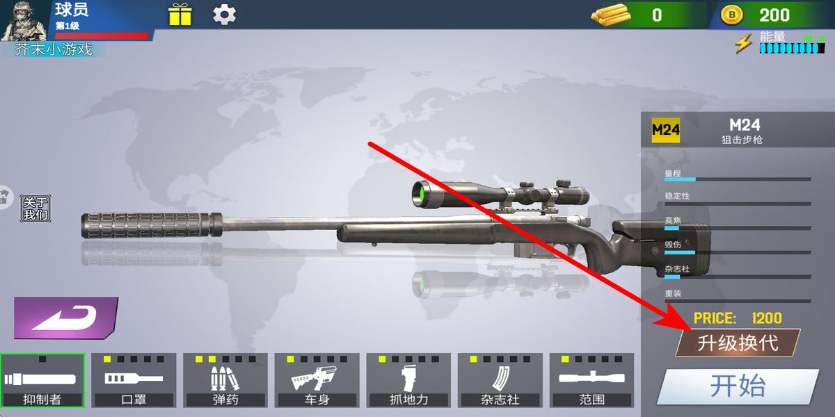 3、積累任務(wù)的金幣,進(jìn)入商店點(diǎn)擊升級(jí)換代提升槍械屬性,優(yōu)先強(qiáng)化射程與穩(wěn)定性,搭配抑制者等配件,增強(qiáng)隱蔽性與傷害輸出能力。
