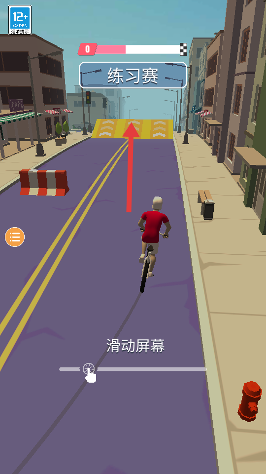 2、競速途中,通過左右滑動屏幕控制自行車轉(zhuǎn)向,遇到彎道時靈活調(diào)整方向,同時留意沿途加速帶,駛過加速帶獲取沖刺加成。