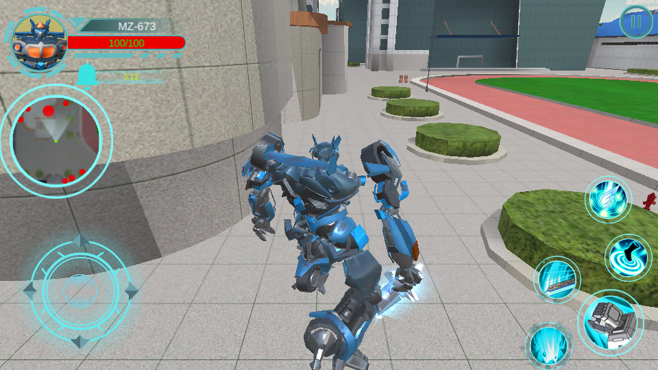 2、戰(zhàn)斗時(shí)鎖定邪惡機(jī)甲目標(biāo),切換不同武器應(yīng)對(duì)敵人弱點(diǎn),當(dāng)敵人逃竄時(shí),點(diǎn)擊變身按鈕激活機(jī)甲變身形態(tài),提升速度追擊對(duì)手。