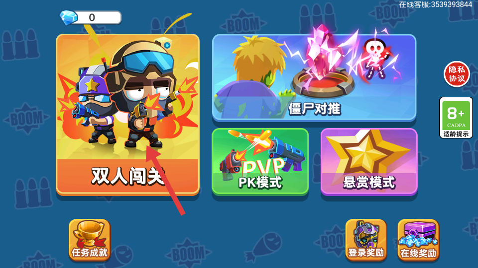 3、完成指定對戰(zhàn)任務后,解鎖更多槍支與塔防道具,進入高難度關(guān)卡挑戰(zhàn)強力BOSS,與隊友配合找到BOSS弱點,合力將其擊敗獲取獎勵。