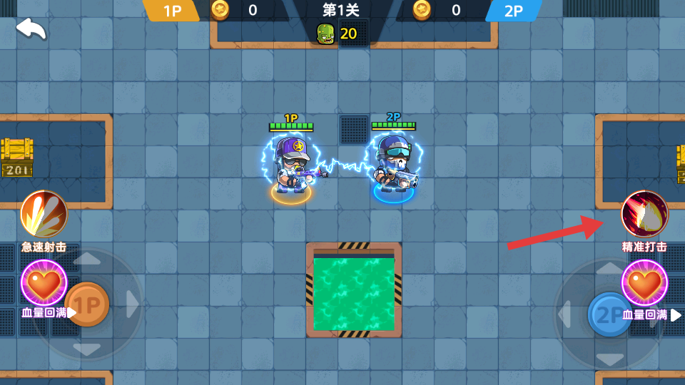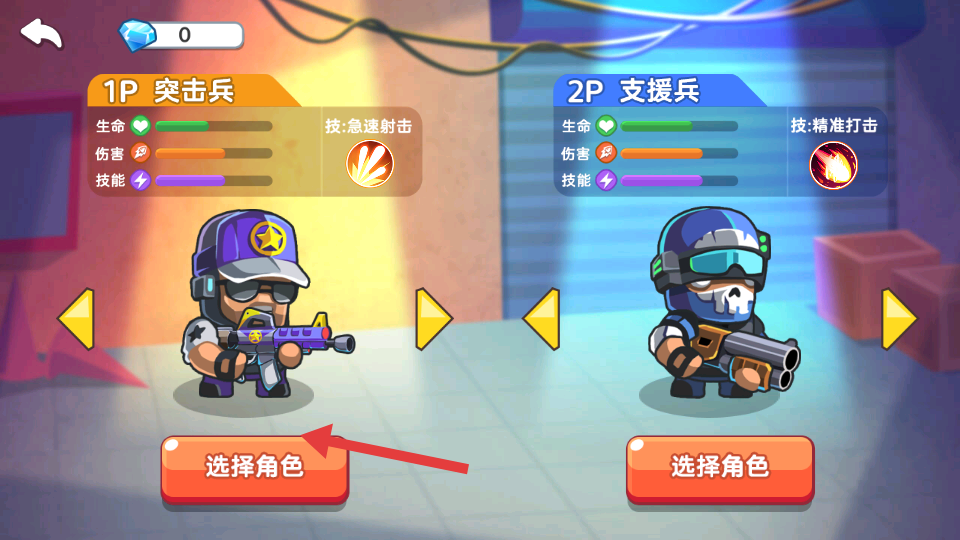 1、進入游戲后,與隊友選擇同屏模式,在角色選擇界面挑選擅長的戰(zhàn)斗角色,搭配初始槍支,進入新手引導關(guān)卡熟悉基礎射擊操作。