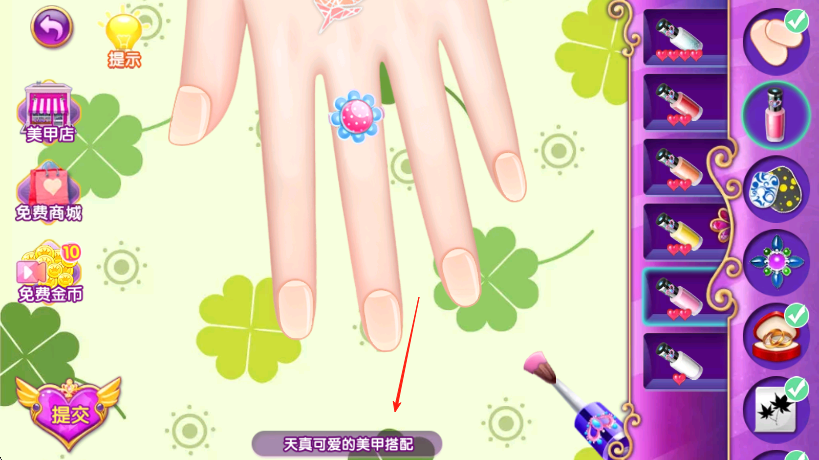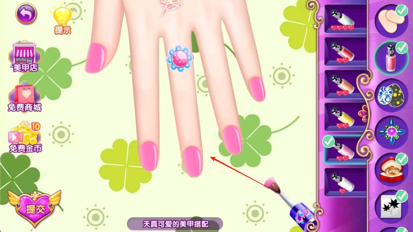 1、進(jìn)入游戲界面,明確美甲主題,如天真可愛(ài)的美甲搭配,構(gòu)思美甲風(fēng)格。