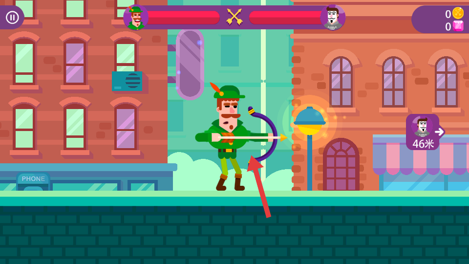 2、在關(guān)卡推進(jìn)過程中,用手指拖動(dòng)屏幕來調(diào)整射箭的角度與發(fā)射力度,緊盯敵人移動(dòng)軌跡,優(yōu)先瞄準(zhǔn)敵人頭部發(fā)射箭矢,擊敗敵人后收集掉落的積分與輔助道具。