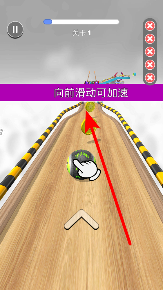 2、觸發(fā)加速向前滑動屏幕可讓小球加速,遇長距離障礙、密集金幣時使用,借助速度快速通過、收集,注意把控時機防碰撞。