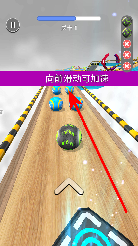 1、操控主球前行:通過屏幕上的操作按鍵或手勢,控制主球在賽道上的平穩(wěn)移動,左右的調(diào)整方向、精準把控速度,避開障礙朝終點奔。