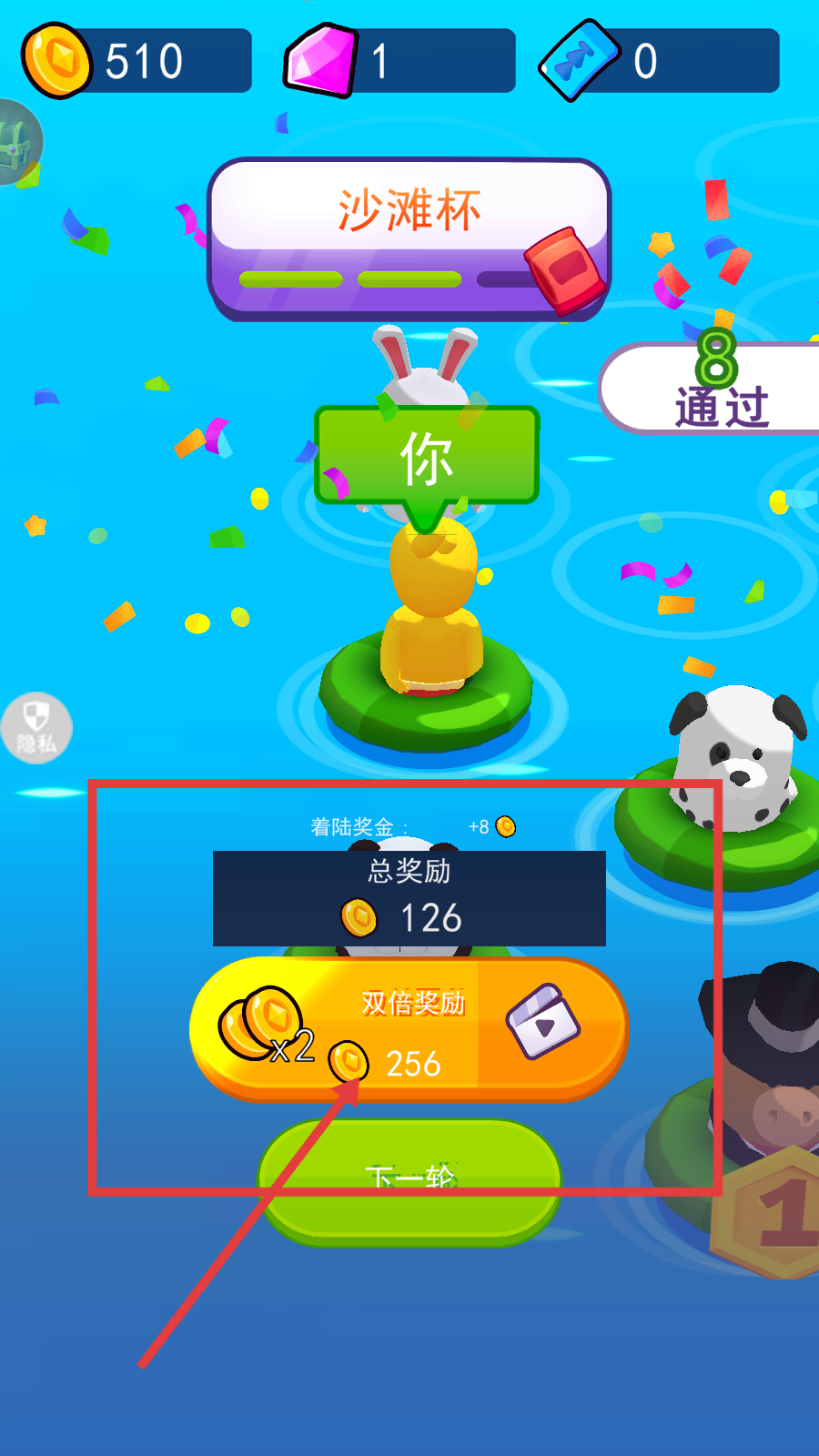 3、完成【回合2-沙灘杯】,領(lǐng)取【126-總獎勵】,觀看廣告解鎖【雙倍獎勵-256】金幣,擴充資產(chǎn)。