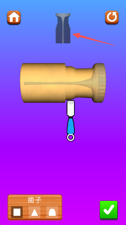 3、持續(xù)調(diào)整雕刻的位置和力度,將木工物件加工成上方展示的目標形狀,完成后點擊綠色對勾按鈕進入下一關(guān)。