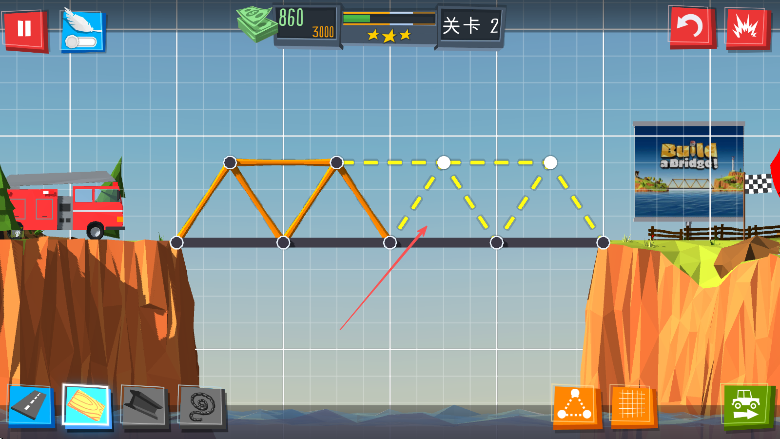 2、查看屏幕上方的金錢數(shù)860、關(guān)卡數(shù)關(guān)卡2等信息、利用下方材料按鈕規(guī)劃搭建橋梁結(jié)構(gòu)。