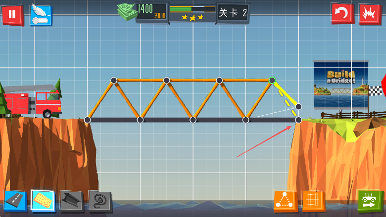 3、持續(xù)調(diào)整橋梁搭建方案、確保橋梁穩(wěn)固能承受車輛重量、成功讓左側(cè)車輛抵達(dá)右側(cè)終點(diǎn)過關(guān)。