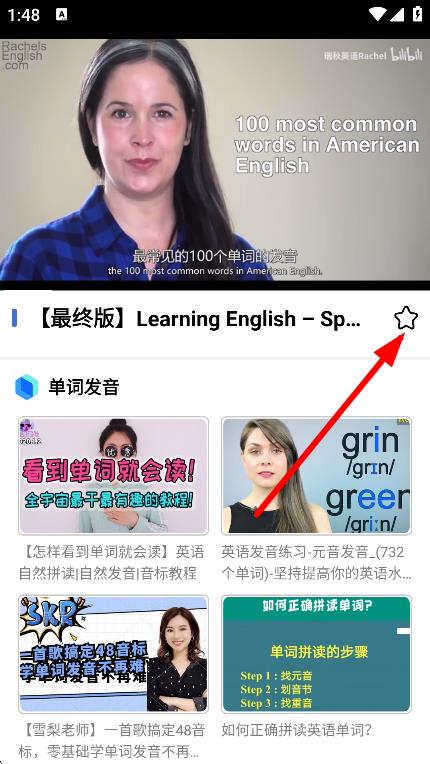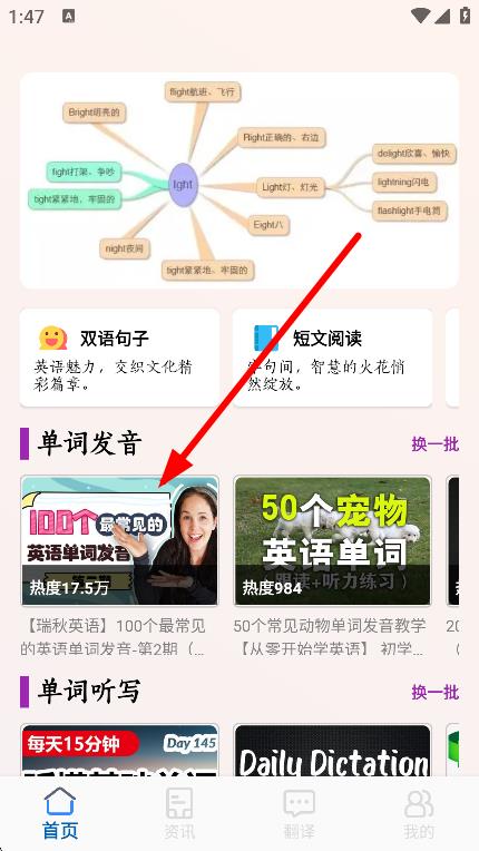 1、在首頁單詞發(fā)音板塊,點(diǎn)擊最常見的英語單詞發(fā)音視頻,進(jìn)入播放頁面。