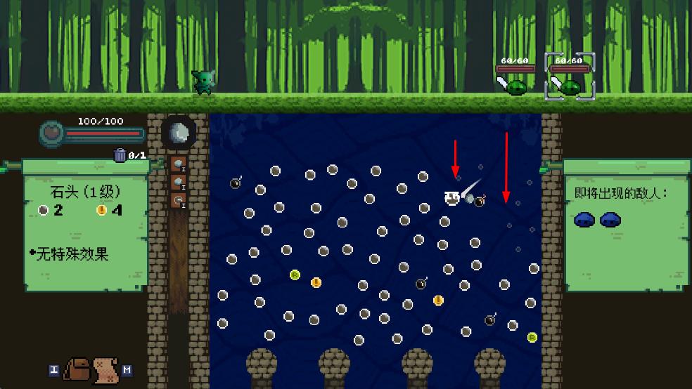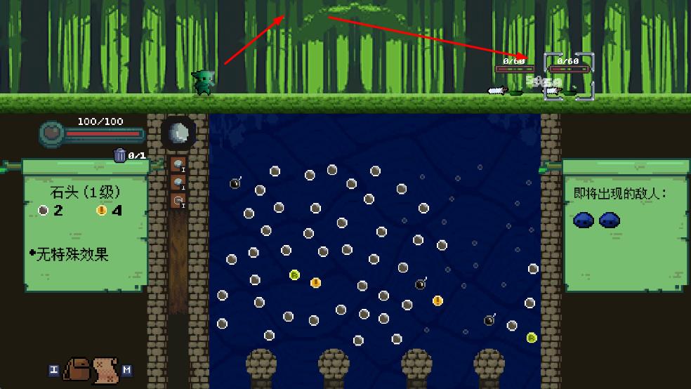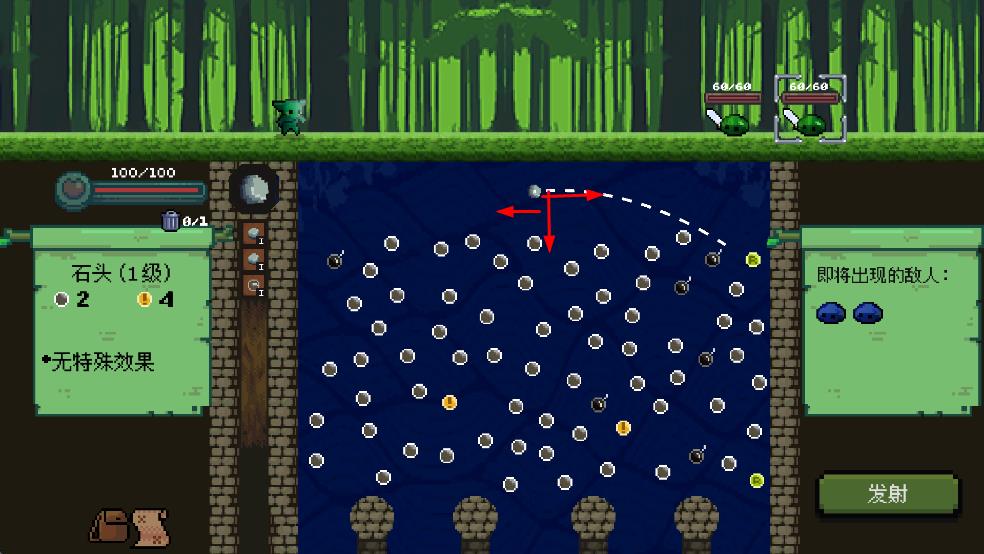 1、選武器如石頭1級(jí),調(diào)發(fā)射角度瞄準(zhǔn)敵人區(qū),點(diǎn)發(fā)射讓彈珠彈跳攻擊。