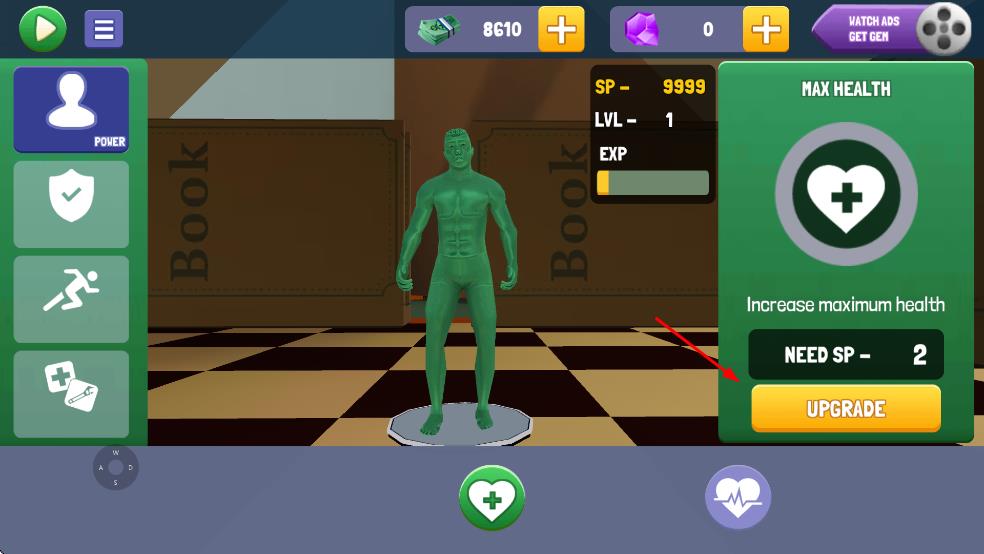 2、進入屬性界面,消耗SP點擊UPGRADE,升級生命值等屬性,強化角色。